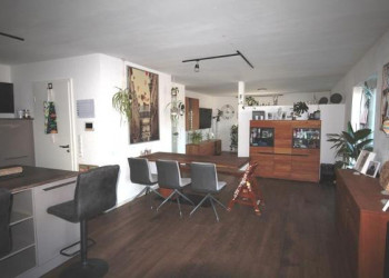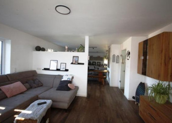 Der großzügige Wohnbereich überzeugt durch seine offene Gestaltung und große Fensterflächen, die ein helles und einladendes Wohngefühl schaffen. Der hochwertige Vinylboden in Holzoptik sorgt zusätzlich für eine warme und moderne Atmosphäre.