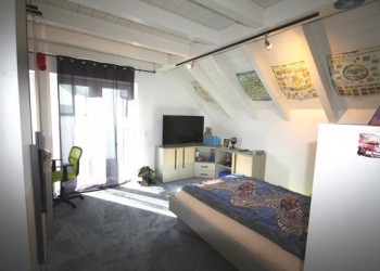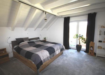 Das großzügige Elternschlafzimmer im Dachgeschoss überzeugt durch sichtbare Dachbalken und ein modernes Raumgefühl. Es verfügt über einen begehbaren Kleiderschrank sowie ein eigenes Badezimmer mit Badewanne, Dusche, Waschbecken und WC. Große Fenster sorgen für viel Tageslicht und ein angenehmes Wohnklima.