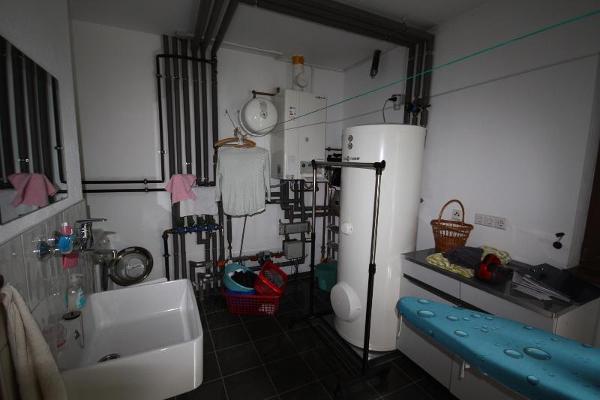 The utility room houses the central heating system and offers sufficient space for a washing machine and dryer. From there, there is also access to the outdoor area.