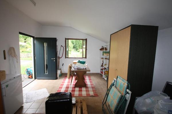 On the ground floor, the entrance area leads to the living/dining area with an open-plan kitchen and adjoining dining room. Access to the garden with a greenhouse is available via the kitchen and living room, leading to the ground-level terrace, a storage room, and the laundry room with the heating system and a shower room with a toilet and vanity.
